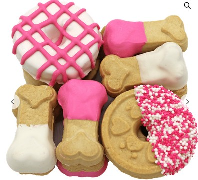Crunchy, oven-baked dog treats decorated with dog-safe pink and white icing. Each 7 oz clamshell includes an adorable assortment of cookie shapes-perfect for gifting or spoiling your pup.
