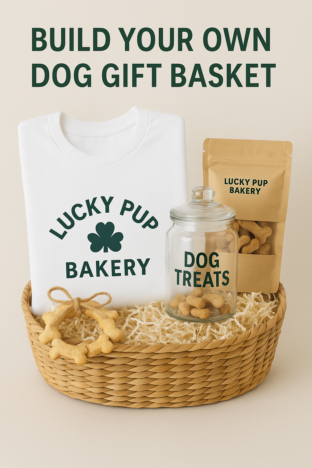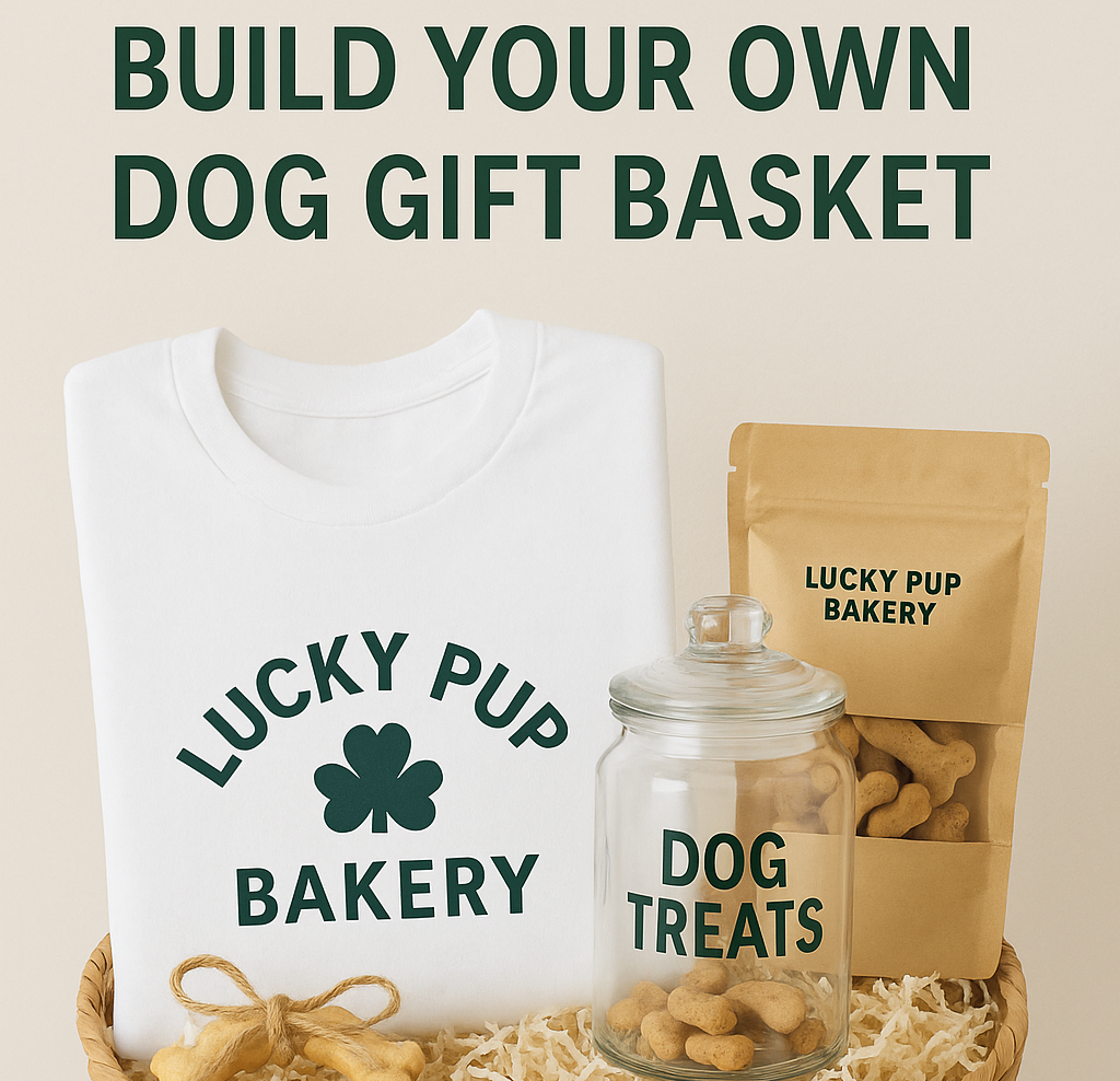 Customize a special basket for your furry friend! Choose any 5oz flavor bag of freshly baked treats, a stylish jar, T-shirt of your choice and a cute bandana.
